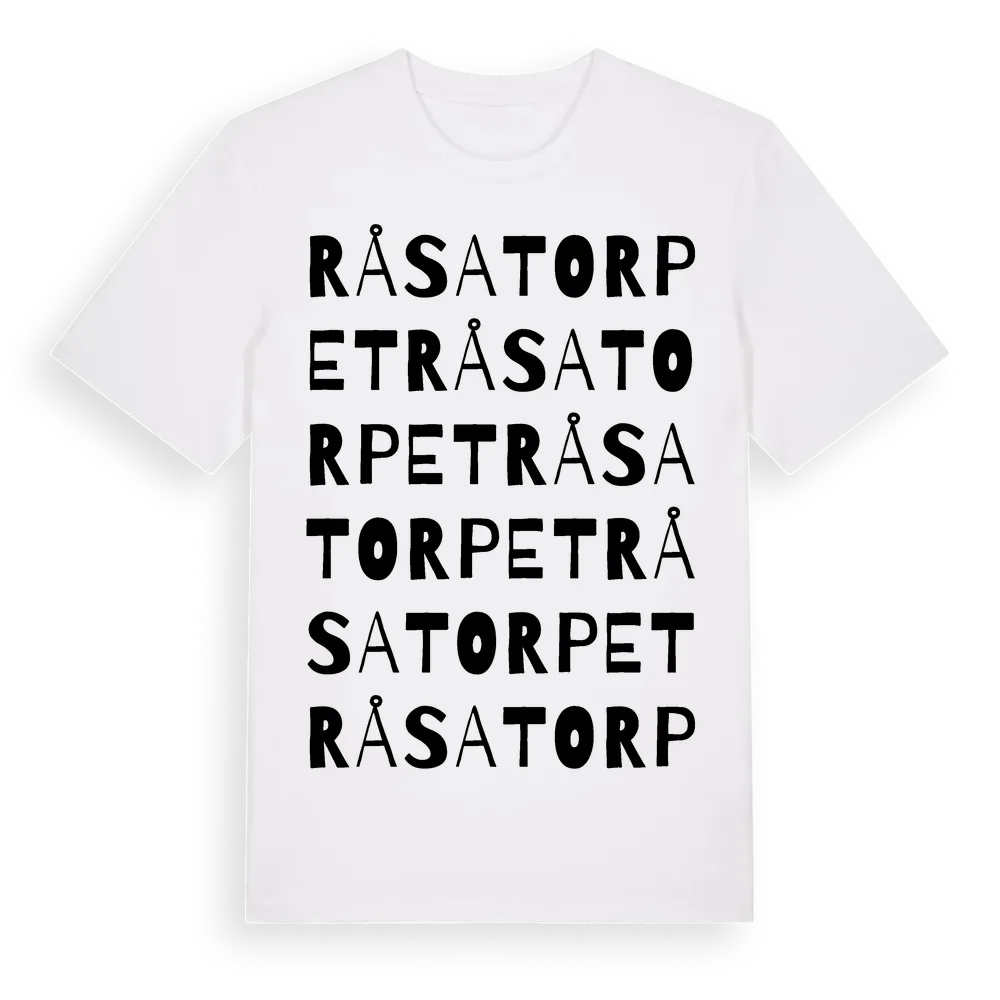 Råsatorpet ordlek t-shirt är inspirerad av Råsatorpet i Blekinge län, Sverige. Tröjan är designad för dig som har en speciell koppling till platsen – oavsett om du bor här, har rötterna här eller bara älskar Råsatorpet.