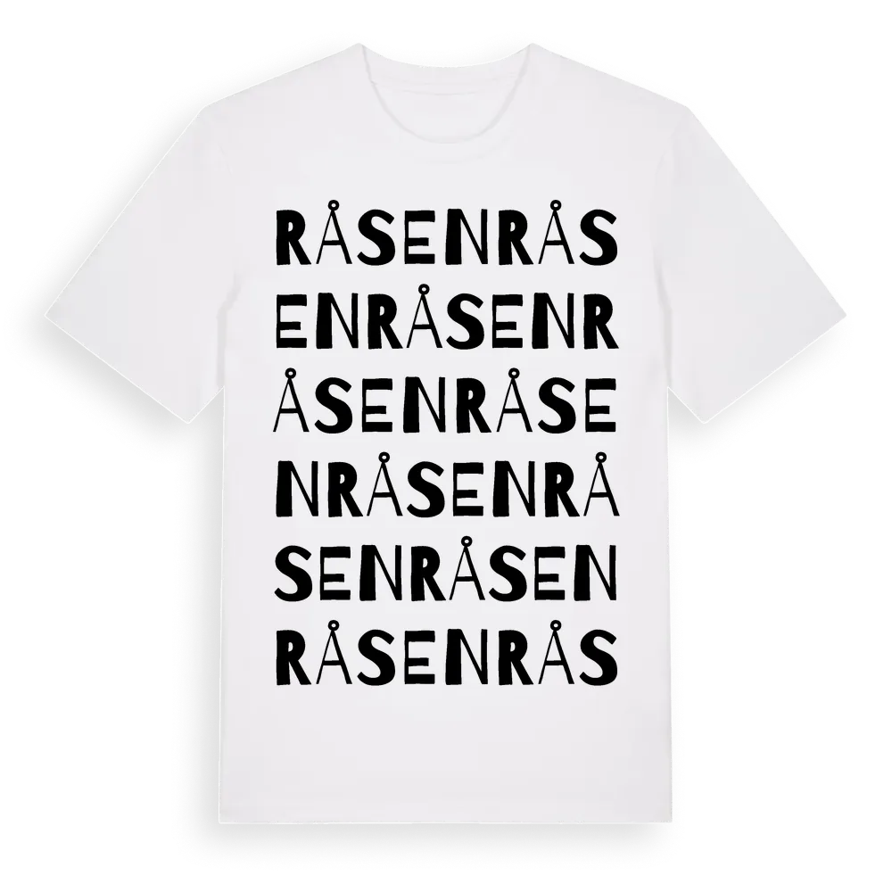 En ordlek byggd på Råsens namn. Subtilt och klurig – ett motiv som bara de som verkligen känner platsen fullt ut förstår. Premium bomull, unisex – från Råsen i Blekinge län.