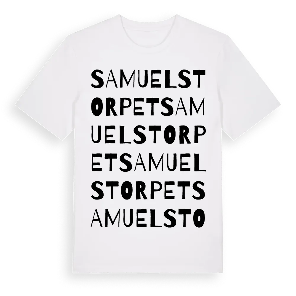 Samuelstorpet ordlek t-shirt är inspirerad av Samuelstorpet i Blekinge län, Sverige. Tröjan är designad för dig som har en speciell koppling till platsen – oavsett om du bor här, har rötterna här eller bara älskar Samuelstorpet.