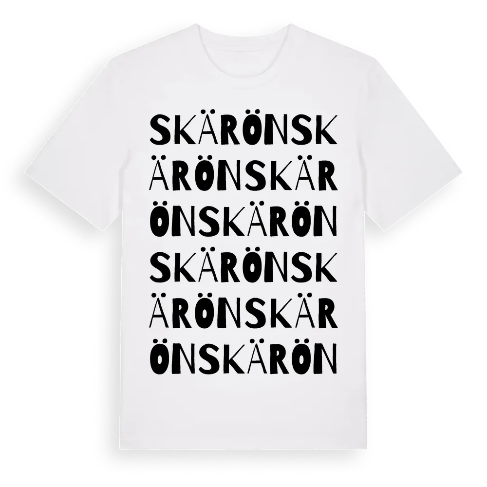 Skärön ordlek t-shirt är inspirerad av Skärön i Blekinge län, Sverige. Tröjan är designad för dig som har en speciell koppling till platsen – oavsett om du bor här, har rötterna här eller bara älskar Skärön.