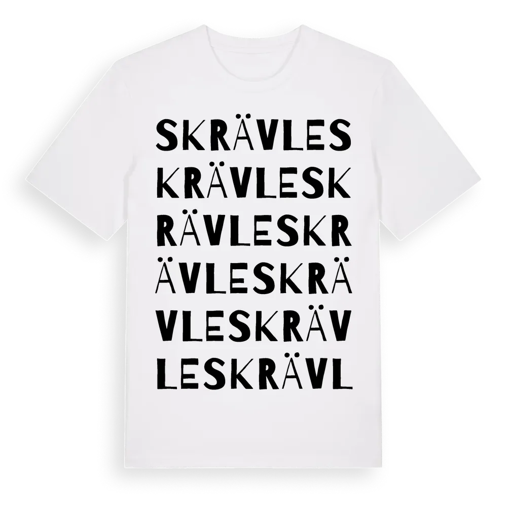 Skrävle ordlek t-shirt är inspirerad av byn Skrävle i Blekinge län, Sverige. Tröjan är designad för dig som har en speciell koppling till platsen – oavsett om du bor här, har rötterna här eller bara älskar Skrävle.
