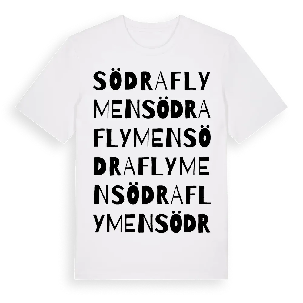 Södra Flymen ordlek t-shirt är inspirerad av Södra Flymen i Blekinge län, Sverige. Tröjan är designad för dig som har en speciell koppling till platsen – oavsett om du bor här, har rötterna här eller bara älskar Södra Flymen.