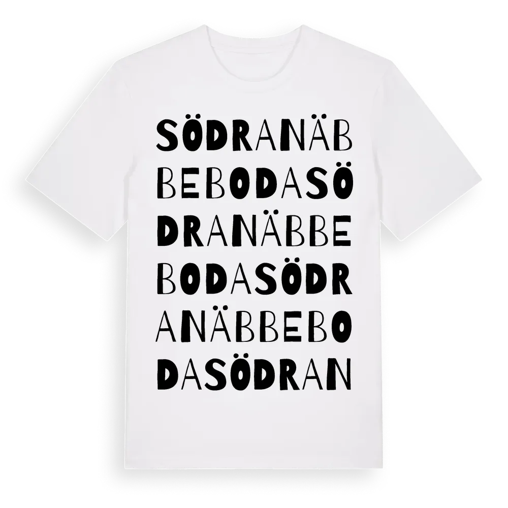 Södra Näbbeboda ordlek t-shirt är inspirerad av Södra Näbbeboda i Blekinge län, Sverige. Tröjan är designad för dig som har en speciell koppling till platsen – oavsett om du bor här, har rötterna här eller bara älskar Södra Näbbeboda.