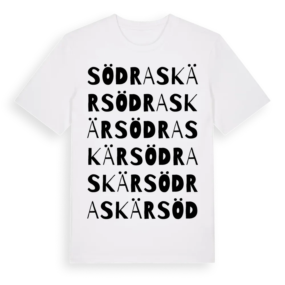 Södraskär ordlek t-shirt är inspirerad av Södraskär i Blekinge län, Sverige. Tröjan är designad för dig som har en speciell koppling till platsen – oavsett om du bor här, har rötterna här eller bara älskar Södraskär.