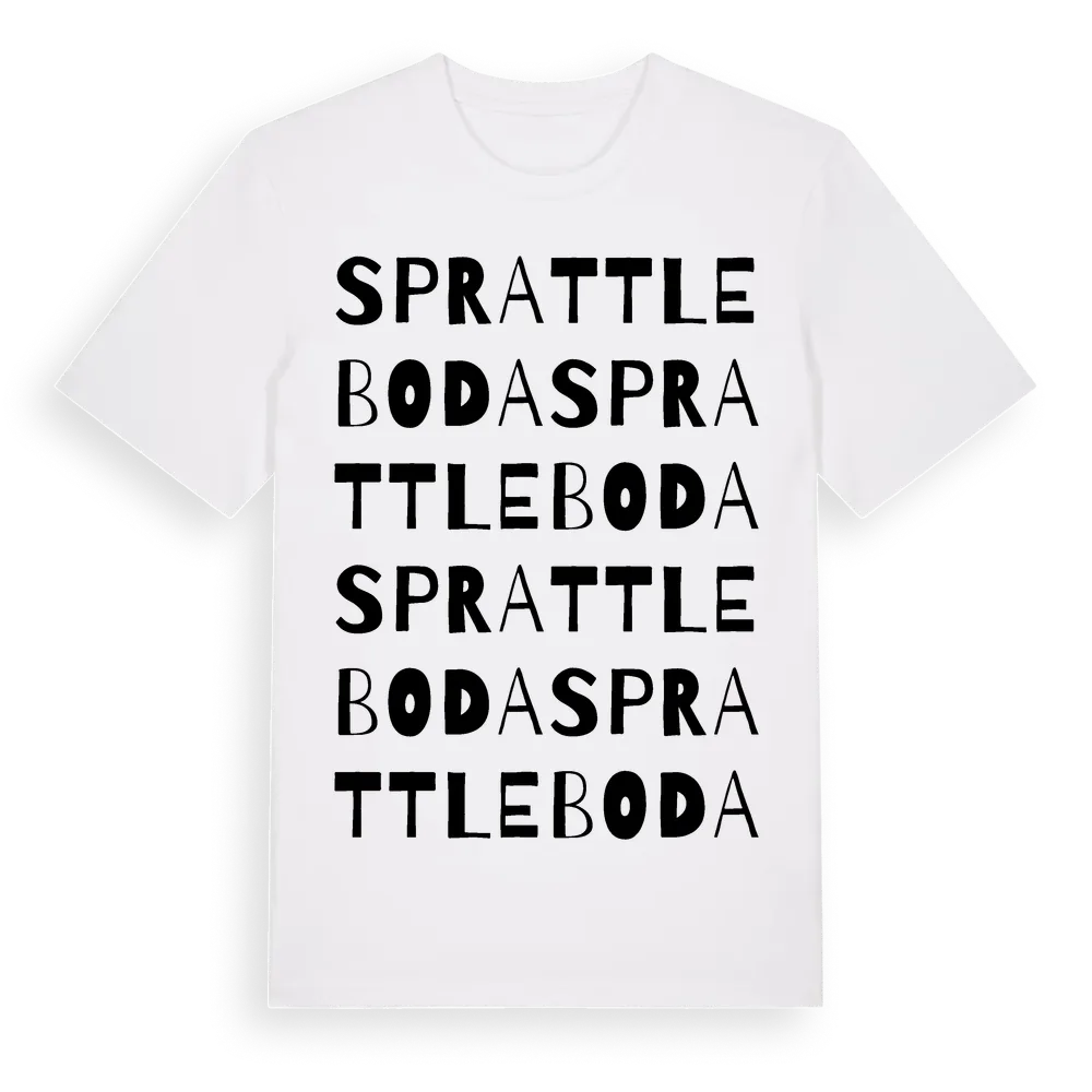 Sprattleboda ordlek t-shirt är inspirerad av Sprattleboda i Blekinge län, Sverige. Tröjan är designad för dig som har en speciell koppling till platsen – oavsett om du bor här, har rötterna här eller bara älskar Sprattleboda.