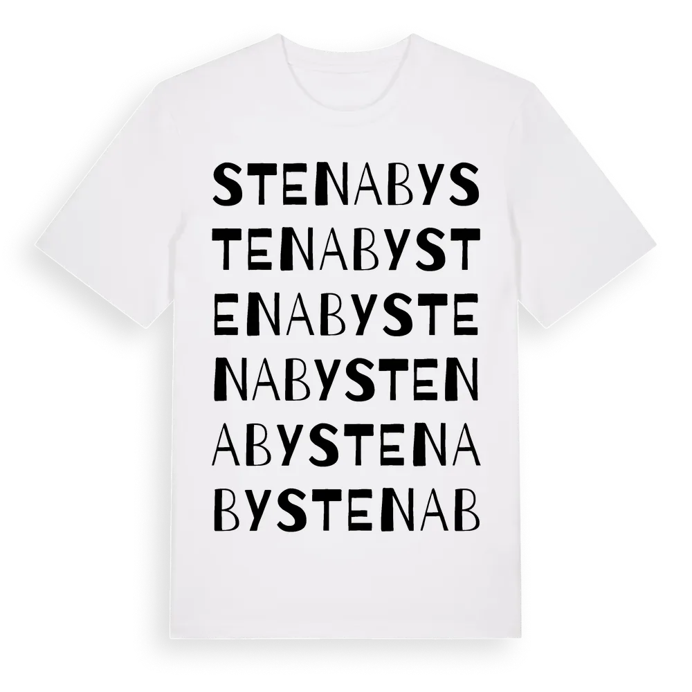 En ordlek byggd på Stenabys namn. Subtilt och klurig – ett motiv som bara de som verkligen känner platsen fullt ut förstår. Premium bomull, unisex – från Stenaby i Blekinge län.