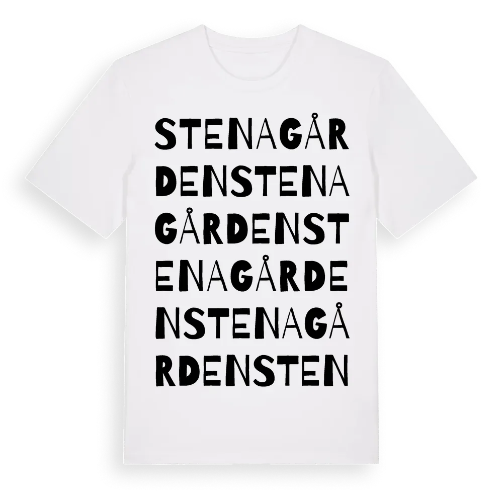 Stenagården ordlek t-shirt är inspirerad av Stenagården i Blekinge län, Sverige. Tröjan är designad för dig som har en speciell koppling till platsen – oavsett om du bor här, har rötterna här eller bara älskar Stenagården.