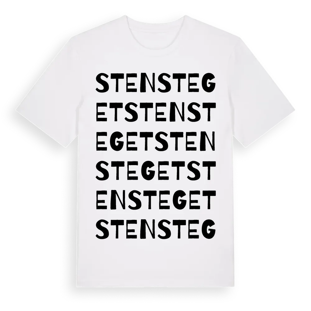 Stensteget ordlek t-shirt är inspirerad av Stensteget i Blekinge län, Sverige. Tröjan är designad för dig som har en speciell koppling till platsen – oavsett om du bor här, har rötterna här eller bara älskar Stensteget.