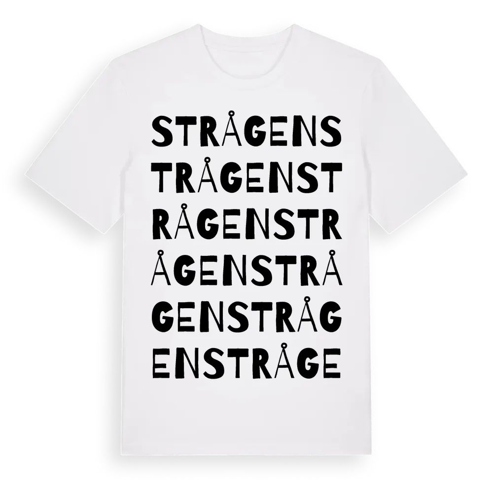 Strågen ordlek t-shirt är inspirerad av Strågen i Blekinge län, Sverige. Tröjan är designad för dig som har en speciell koppling till platsen – oavsett om du bor här, har rötterna här eller bara älskar Strågen.