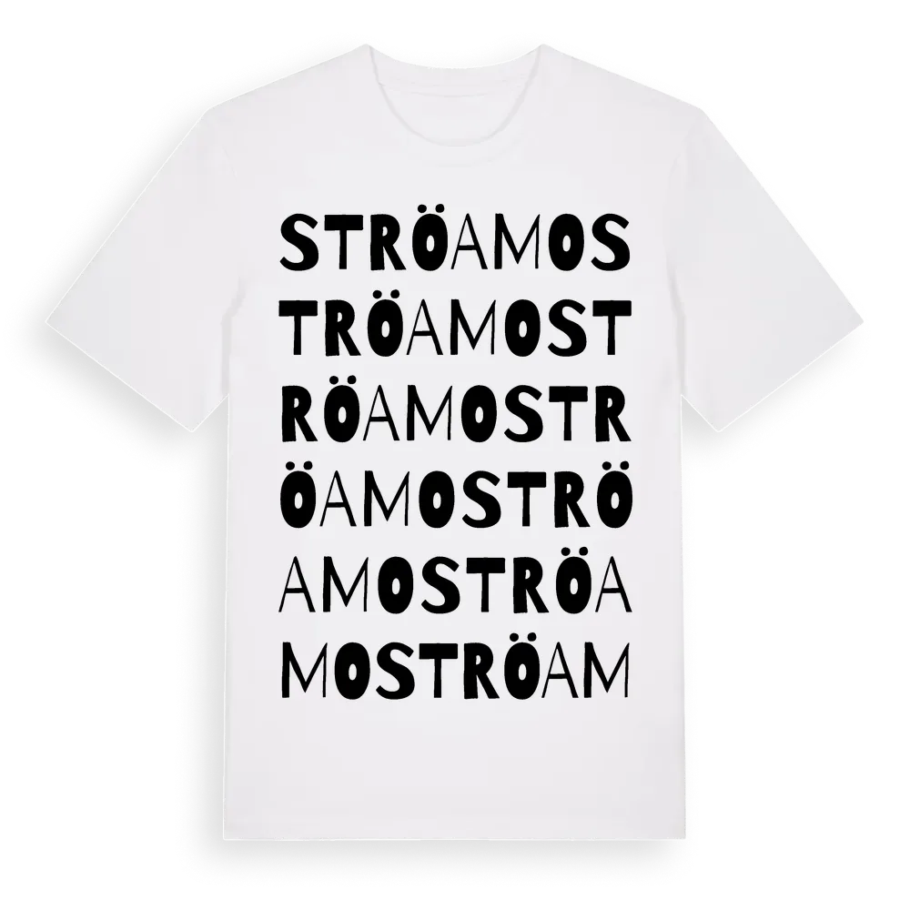 En ordlek byggd på Ströamos namn. Subtilt och klurig – ett motiv som bara de som verkligen känner platsen fullt ut förstår. Premium bomull, unisex – från Ströamo i Blekinge län.