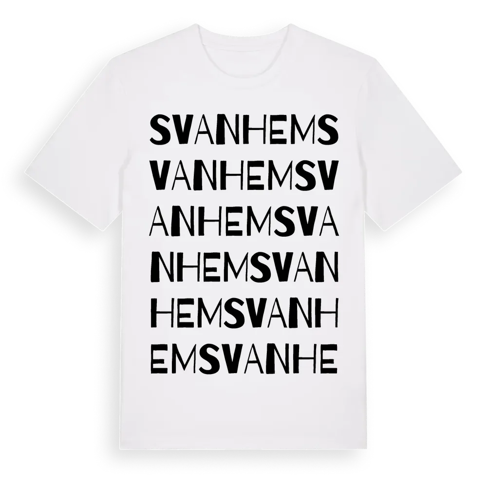 Svanhem ordlek t-shirt är inspirerad av Svanhem i Blekinge län, Sverige. Tröjan är designad för dig som har en speciell koppling till platsen – oavsett om du bor här, har rötterna här eller bara älskar Svanhem.