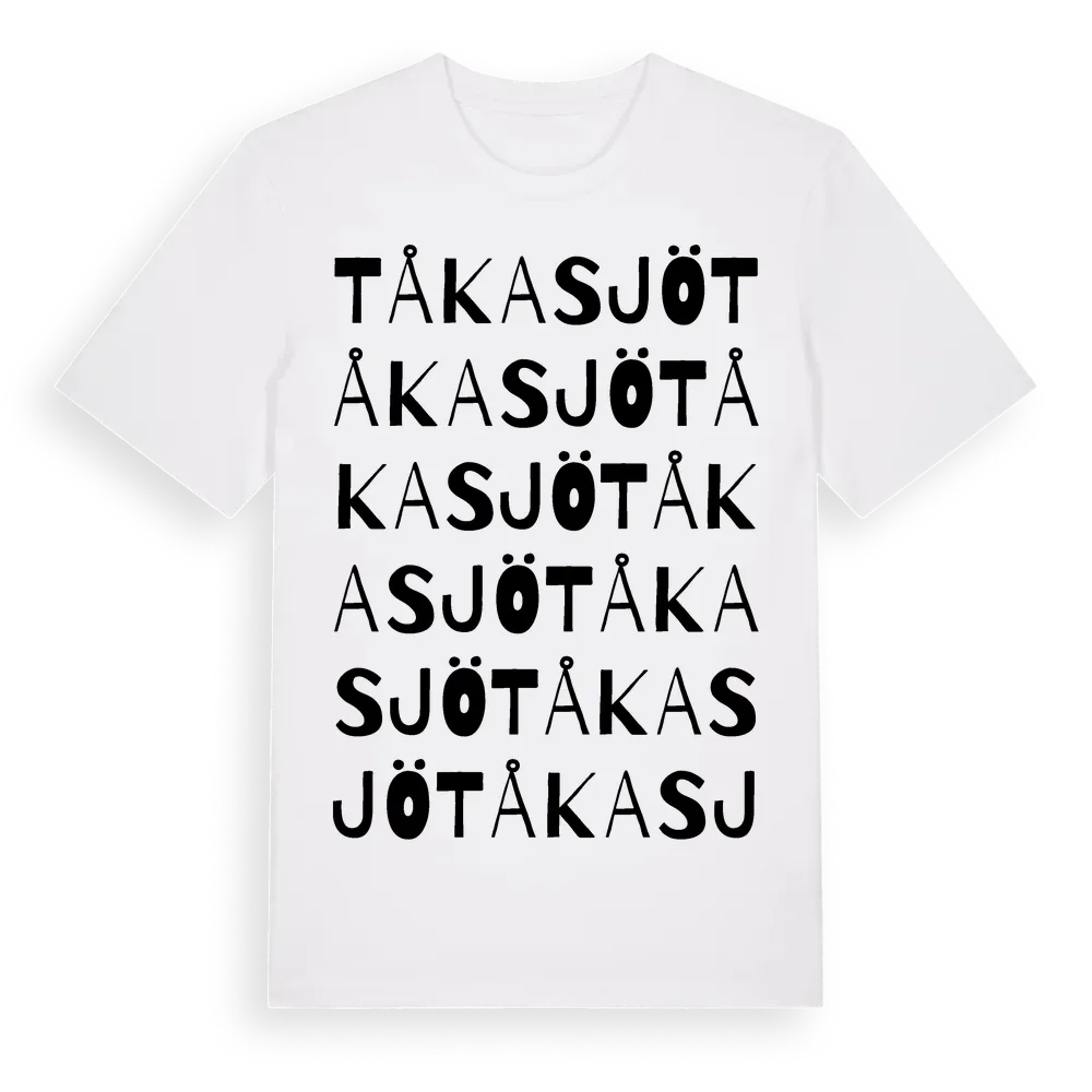 Tåkasjö ordlek t-shirt är inspirerad av Tåkasjö i Blekinge län, Sverige. Tröjan är designad för dig som har en speciell koppling till platsen – oavsett om du bor här, har rötterna här eller bara älskar Tåkasjö.