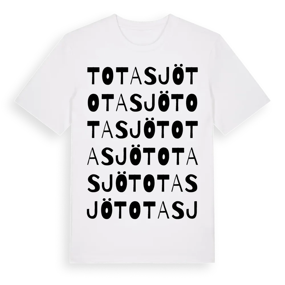 Totasjö ordlek t-shirt är inspirerad av byn Totasjö i Blekinge län, Sverige. Tröjan är designad för dig som har en speciell koppling till platsen – oavsett om du bor här, har rötterna här eller bara älskar Totasjö.