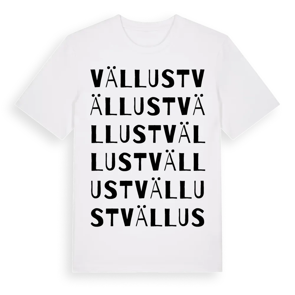 Vällust ordlek t-shirt är inspirerad av Vällust i Blekinge län, Sverige. Tröjan är designad för dig som har en speciell koppling till platsen – oavsett om du bor här, har rötterna här eller bara älskar Vällust.