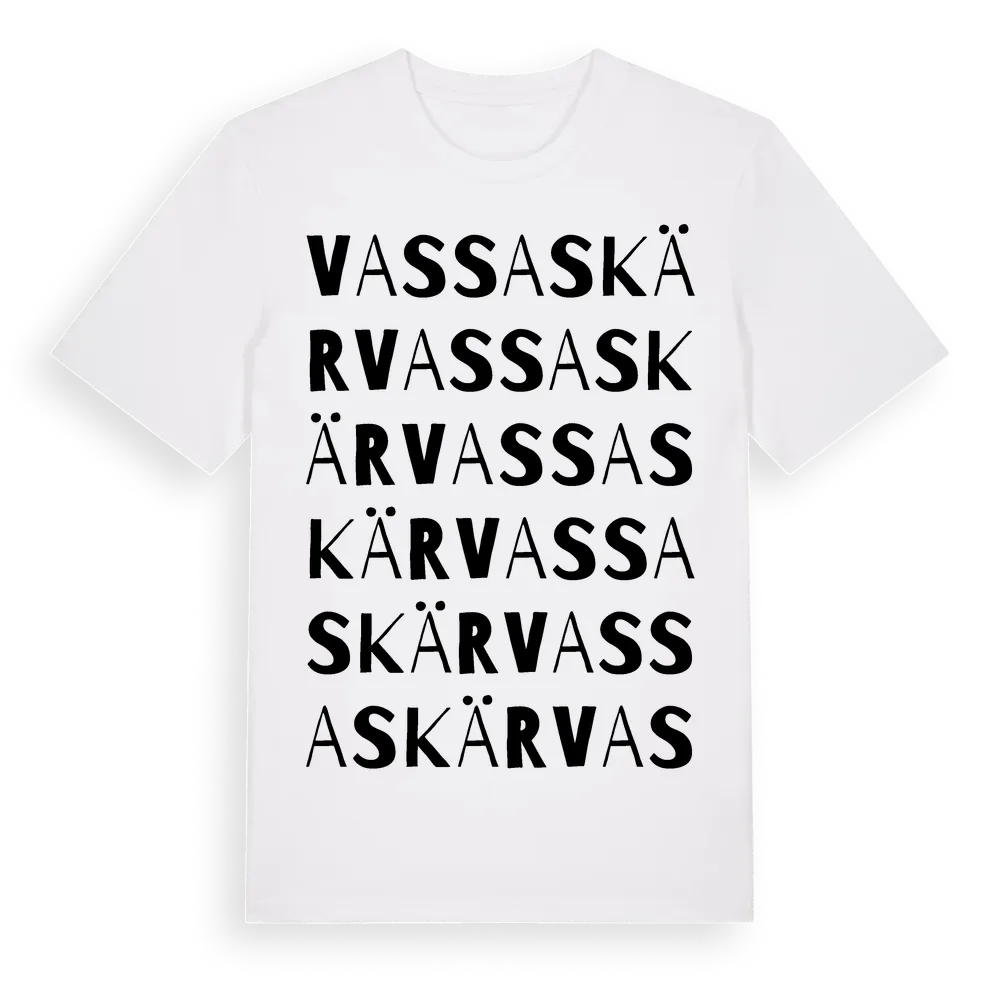 Vassaskär ordlek t-shirt är inspirerad av Vassaskär i Blekinge län, Sverige. Tröjan är designad för dig som har en speciell koppling till platsen – oavsett om du bor här, har rötterna här eller bara älskar Vassaskär.