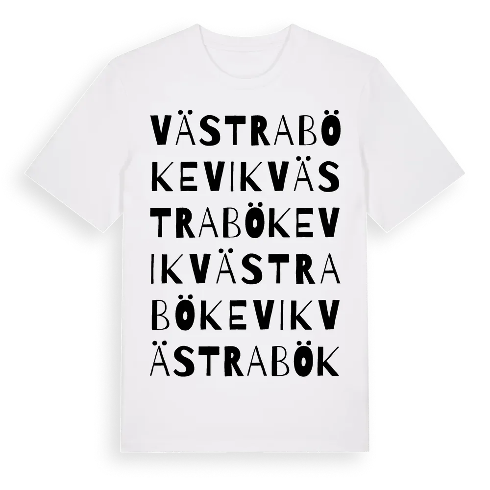 Västra Bökevik ordlek t-shirt är inspirerad av byn Västra Bökevik i Blekinge län, Sverige. Tröjan är designad för dig som har en speciell koppling till platsen – oavsett om du bor här, har rötterna här eller bara älskar Västra Bökevik.