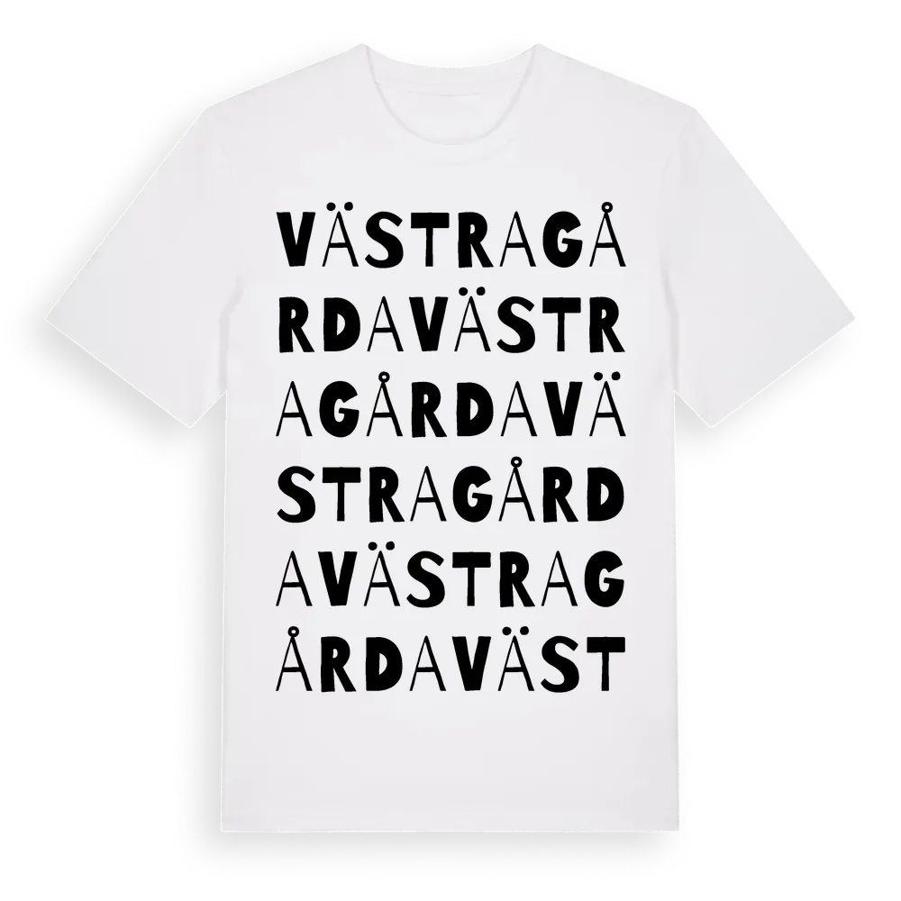 Västra Gårda ordlek t-shirt är inspirerad av byn Västra Gårda i Blekinge län, Sverige. Tröjan är designad för dig som har en speciell koppling till platsen – oavsett om du bor här, har rötterna här eller bara älskar Västra Gårda.