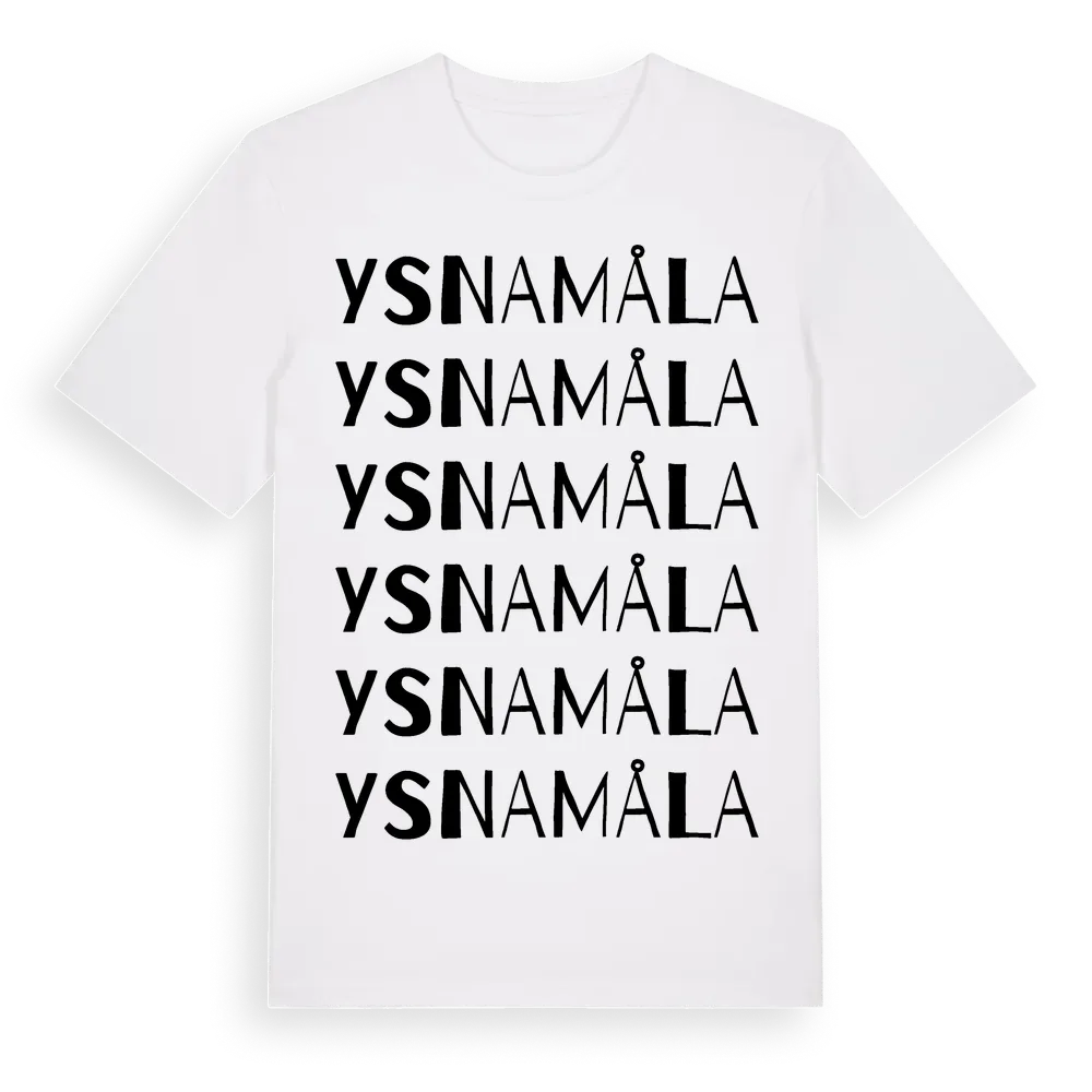 Ysnamåla ordlek t-shirt är inspirerad av byn Ysnamåla i Blekinge län, Sverige. Tröjan är designad för dig som har en speciell koppling till platsen – oavsett om du bor här, har rötterna här eller bara älskar Ysnamåla.