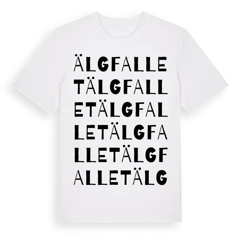 Älgfallet ordlek t-shirt är inspirerad av Älgfallet i Dalarnas län, Sverige. Tröjan är designad för dig som har en speciell koppling till platsen – oavsett om du bor här, har rötterna här eller bara älskar Älgfallet.