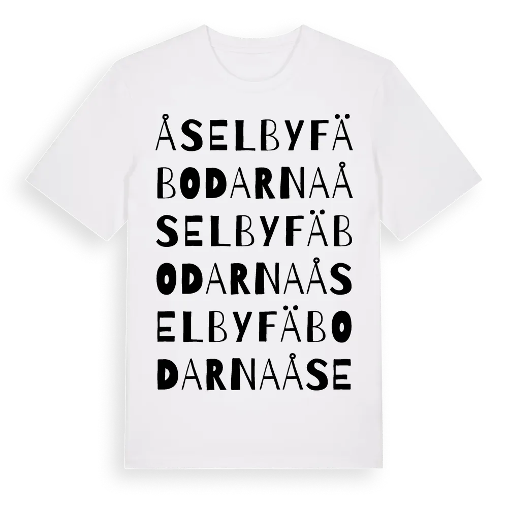 Åselbyfäbodarna ordlek t-shirt är inspirerad av Åselbyfäbodarna i Dalarnas län, Sverige. Tröjan är designad för dig som har en speciell koppling till platsen – oavsett om du bor här, har rötterna här eller bara älskar Åselbyfäbodarna.