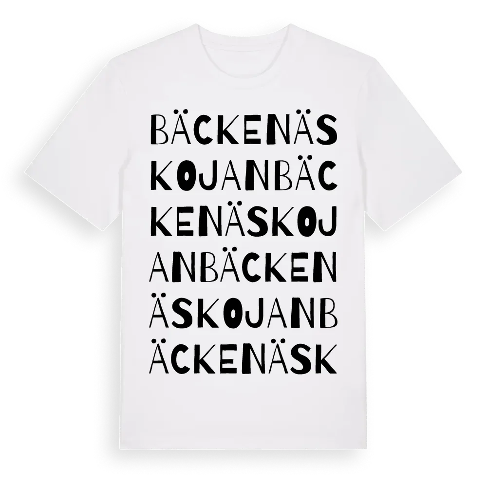 Bäckenäskojan ordlek t-shirt är inspirerad av Bäckenäskojan i Dalarnas län, Sverige. Tröjan är designad för dig som har en speciell koppling till platsen – oavsett om du bor här, har rötterna här eller bara älskar Bäckenäskojan.