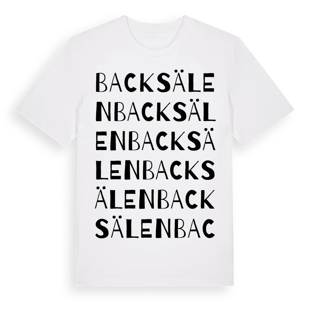Backsälen ordlek t-shirt är inspirerad av byn Backsälen i Dalarnas län, Sverige. Tröjan är designad för dig som har en speciell koppling till platsen – oavsett om du bor här, har rötterna här eller bara älskar Backsälen.