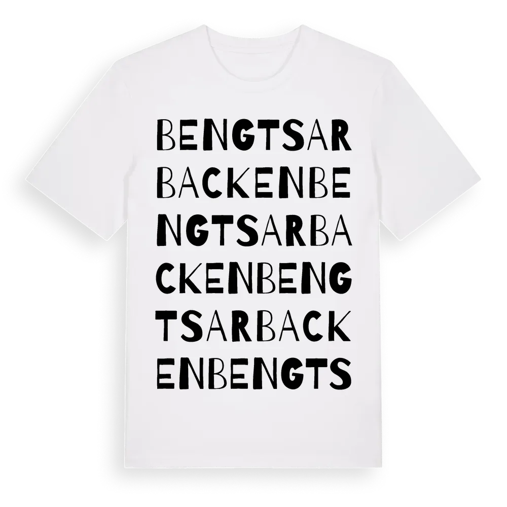 En ordlek byggd på Bengtsarbackens namn. Subtilt och klurig – ett motiv som bara de som verkligen känner platsen fullt ut förstår. Premium bomull, unisex – från Bengtsarbacken i Dalarnas län.