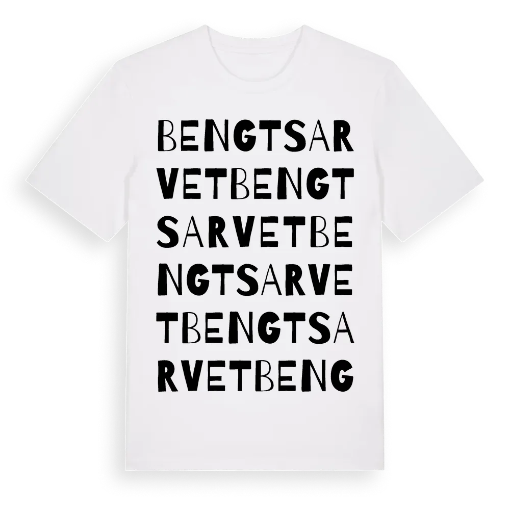 En ordlek byggd på Bengtsarvets namn. Subtilt och klurig – ett motiv som bara de som verkligen känner platsen fullt ut förstår. Premium bomull, unisex – från byn Bengtsarvet i Dalarnas län.
