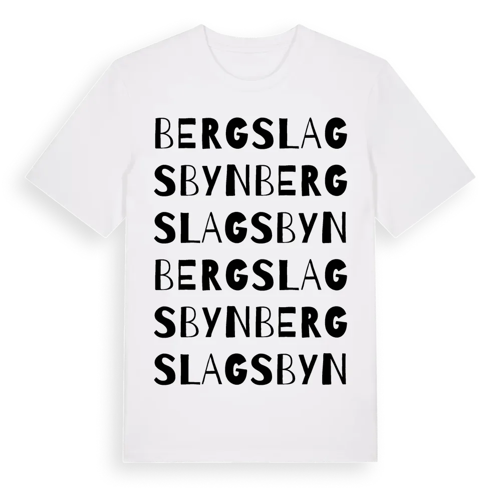 Bergslagsbyn ordlek t-shirt är inspirerad av stadsdelen Bergslagsbyn i Dalarnas län, Sverige. Tröjan är designad för dig som har en speciell koppling till platsen – oavsett om du bor här, har rötterna här eller bara älskar Bergslagsbyn.