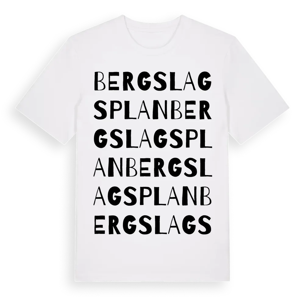 Bergslagsplan ordlek t-shirt är inspirerad av Bergslagsplan i Dalarnas län, Sverige. Tröjan är designad för dig som har en speciell koppling till platsen – oavsett om du bor här, har rötterna här eller bara älskar Bergslagsplan.
