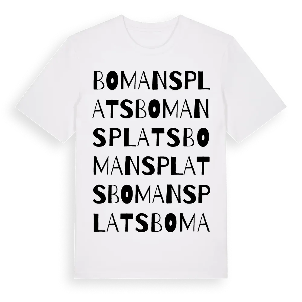 Bomans Plats ordlek t-shirt är inspirerad av Bomans Plats i Dalarnas län, Sverige. Tröjan är designad för dig som har en speciell koppling till platsen – oavsett om du bor här, har rötterna här eller bara älskar Bomans Plats.
