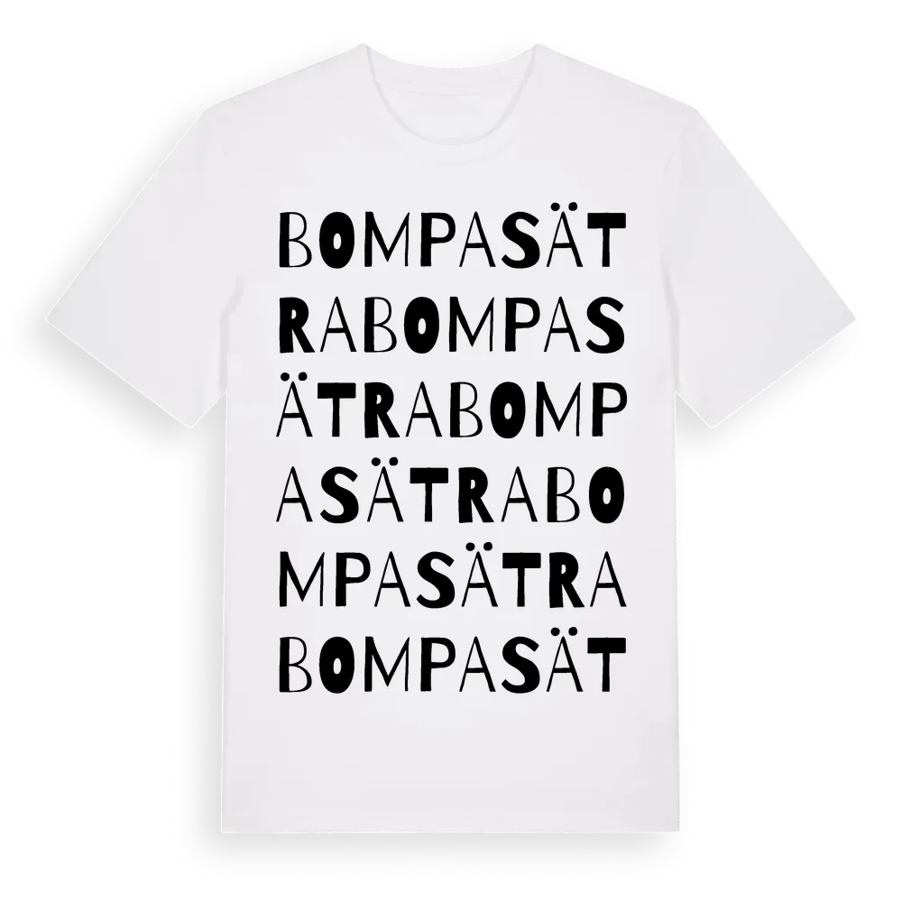 Bompasätra ordlek t-shirt är inspirerad av byn Bompasätra i Dalarnas län, Sverige. Tröjan är designad för dig som har en speciell koppling till platsen – oavsett om du bor här, har rötterna här eller bara älskar Bompasätra.
