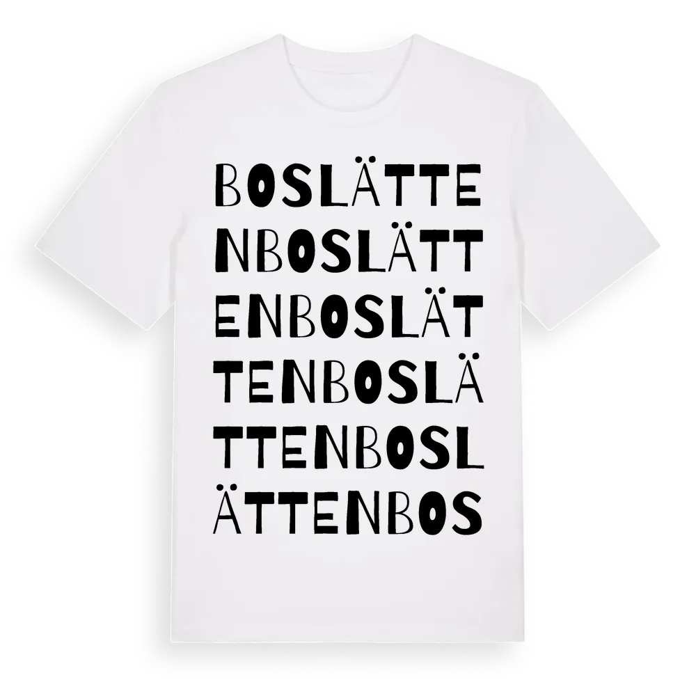 Boslätten ordlek t-shirt är inspirerad av byn Boslätten i Dalarnas län, Sverige. Tröjan är designad för dig som har en speciell koppling till platsen – oavsett om du bor här, har rötterna här eller bara älskar Boslätten.