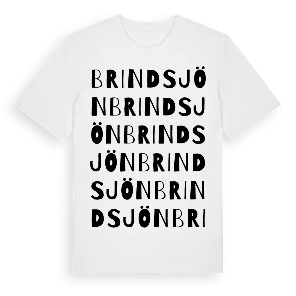 Brindsjön ordlek t-shirt är inspirerad av byn Brindsjön i Dalarnas län, Sverige. Tröjan är designad för dig som har en speciell koppling till platsen – oavsett om du bor här, har rötterna här eller bara älskar Brindsjön.