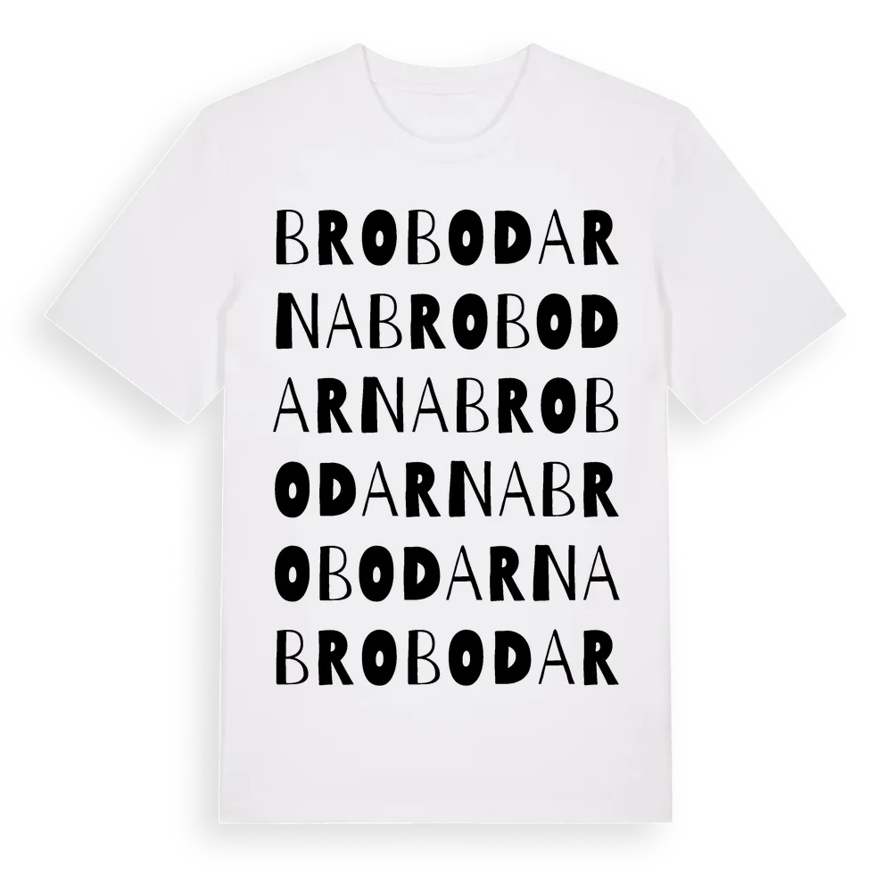 Brobodarna ordlek t-shirt är inspirerad av Brobodarna i Dalarnas län, Sverige. Tröjan är designad för dig som har en speciell koppling till platsen – oavsett om du bor här, har rötterna här eller bara älskar Brobodarna.