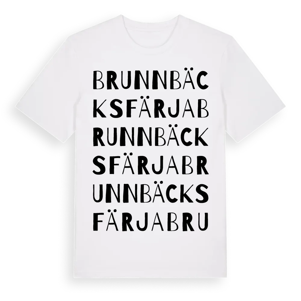 Brunnbäcks Färja ordlek t-shirt är inspirerad av Brunnbäcks Färja i Dalarnas län, Sverige. Tröjan är designad för dig som har en speciell koppling till platsen – oavsett om du bor här, har rötterna här eller bara älskar Brunnbäcks Färja.