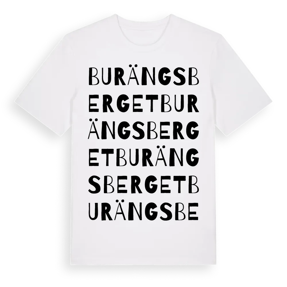 Burängsberget ordlek t-shirt är inspirerad av Burängsberget i Dalarnas län, Sverige. Tröjan är designad för dig som har en speciell koppling till platsen – oavsett om du bor här, har rötterna här eller bara älskar Burängsberget.