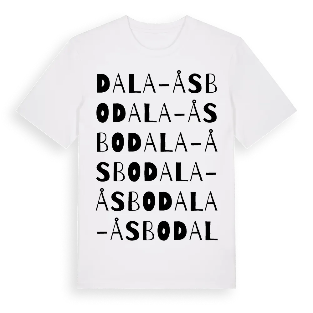 Dala-Åsbo ordlek t-shirt är inspirerad av Dala-Åsbo i Dalarnas län, Sverige. Tröjan är designad för dig som har en speciell koppling till platsen – oavsett om du bor här, har rötterna här eller bara älskar Dala-Åsbo.