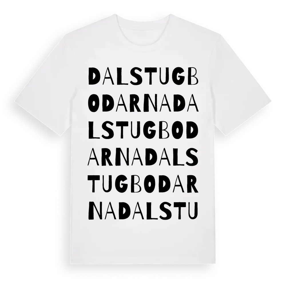 Dalstugbodarna ordlek t-shirt är inspirerad av byn Dalstugbodarna i Dalarnas län, Sverige. Tröjan är designad för dig som har en speciell koppling till platsen – oavsett om du bor här, har rötterna här eller bara älskar Dalstugbodarna.