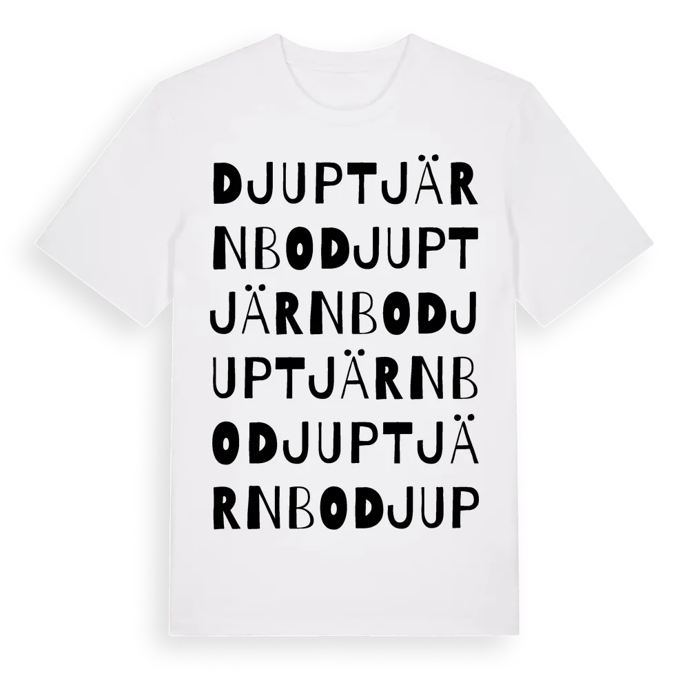 Djuptjärnbo ordlek t-shirt är inspirerad av byn Djuptjärnbo i Dalarnas län, Sverige. Tröjan är designad för dig som har en speciell koppling till platsen – oavsett om du bor här, har rötterna här eller bara älskar Djuptjärnbo.