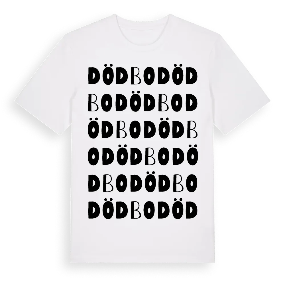 En ordlek byggd på Dödbos namn. Subtilt och klurig – ett motiv som bara de som verkligen känner platsen fullt ut förstår. Premium bomull, unisex – från Dödbo i Dalarnas län.