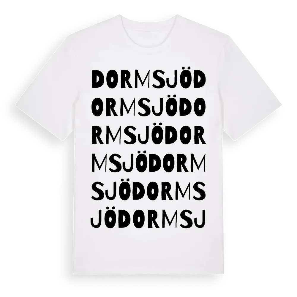 Dormsjö ordlek t-shirt är inspirerad av byn Dormsjö i Dalarnas län, Sverige. Tröjan är designad för dig som har en speciell koppling till platsen – oavsett om du bor här, har rötterna här eller bara älskar Dormsjö.