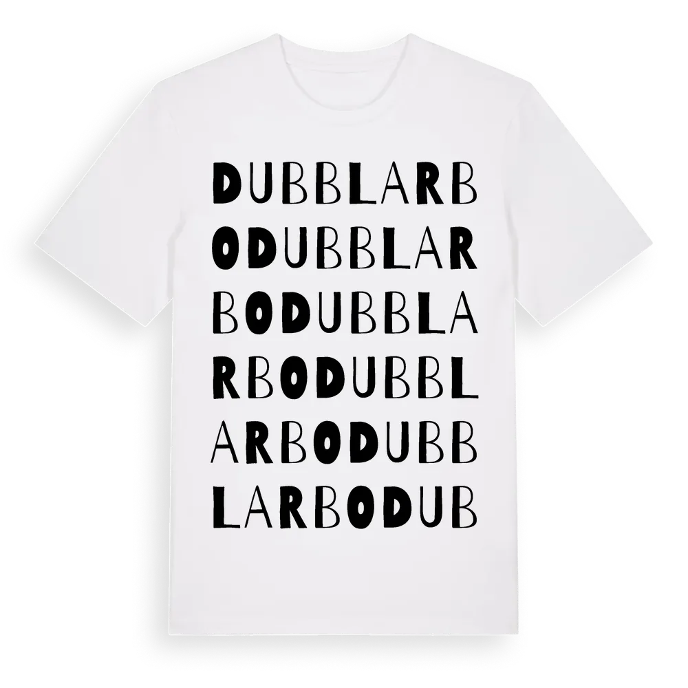 Dubblarbo ordlek t-shirt är inspirerad av Dubblarbo i Dalarnas län, Sverige. Tröjan är designad för dig som har en speciell koppling till platsen – oavsett om du bor här, har rötterna här eller bara älskar Dubblarbo.