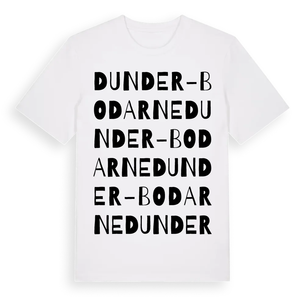 Dunder-Bodarne ordlek t-shirt är inspirerad av byn Dunder-Bodarne i Dalarnas län, Sverige. Tröjan är designad för dig som har en speciell koppling till platsen – oavsett om du bor här, har rötterna här eller bara älskar Dunder-Bodarne.