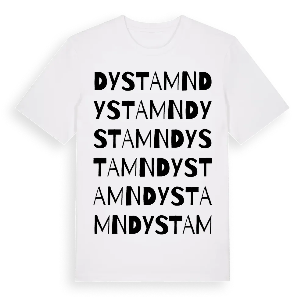 En ordlek byggd på Dystamns namn. Subtilt och klurig – ett motiv som bara de som verkligen känner platsen fullt ut förstår. Premium bomull, unisex – från Dystamn i Dalarnas län.