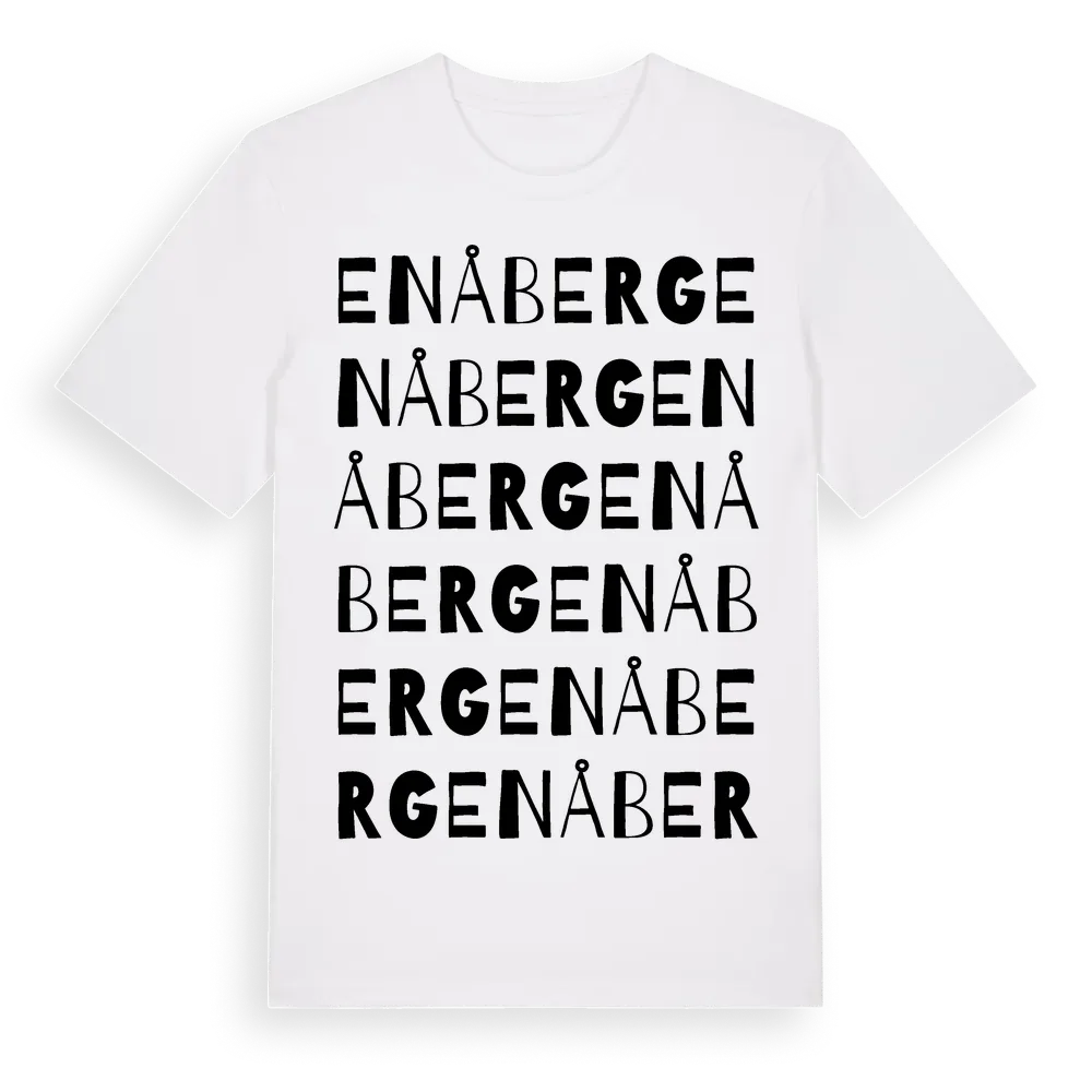 Enåberg ordlek t-shirt är inspirerad av byn Enåberg i Dalarnas län, Sverige. Tröjan är designad för dig som har en speciell koppling till platsen – oavsett om du bor här, har rötterna här eller bara älskar Enåberg.