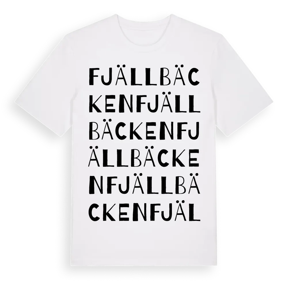 Fjällbäcken ordlek t-shirt är inspirerad av byn Fjällbäcken i Dalarnas län, Sverige. Tröjan är designad för dig som har en speciell koppling till platsen – oavsett om du bor här, har rötterna här eller bara älskar Fjällbäcken.