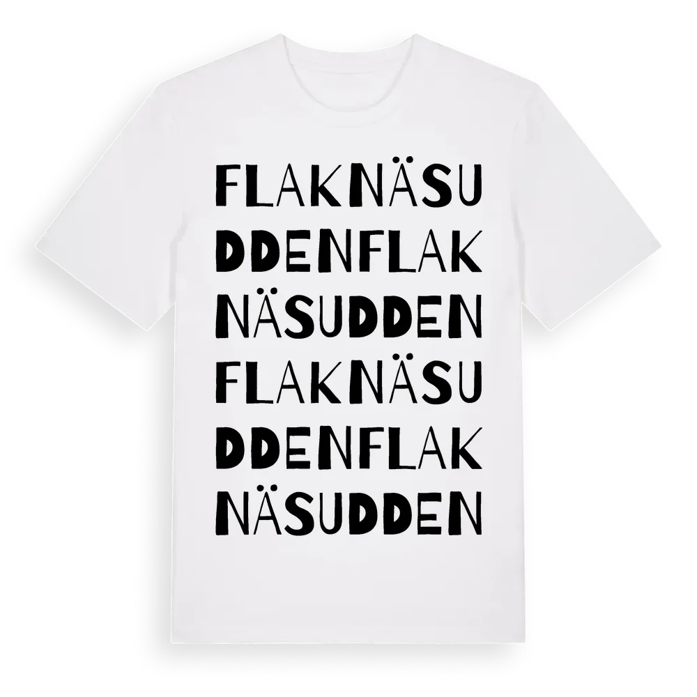 Flaknäsudden ordlek t-shirt är inspirerad av Flaknäsudden i Dalarnas län, Sverige. Tröjan är designad för dig som har en speciell koppling till platsen – oavsett om du bor här, har rötterna här eller bara älskar Flaknäsudden.