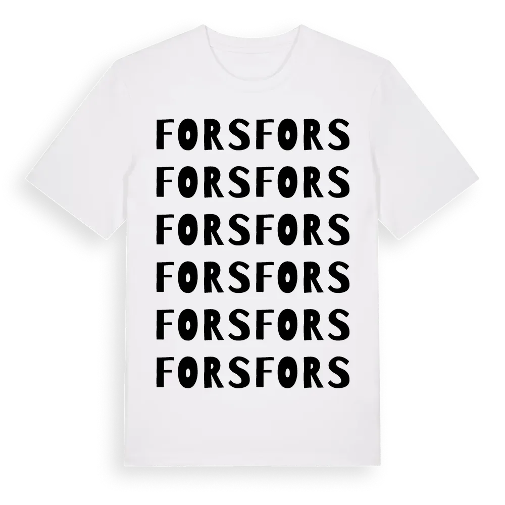 En ordlek byggd på Forss namn. Subtilt och klurig – ett motiv som bara de som verkligen känner platsen fullt ut förstår. Premium bomull, unisex – från byn Fors i Dalarnas län.