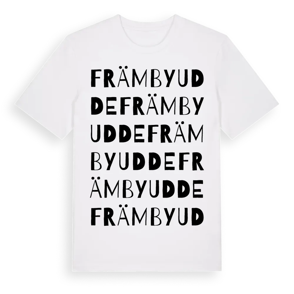 Främby Udde ordlek t-shirt är inspirerad av Främby Udde i Dalarnas län, Sverige. Tröjan är designad för dig som har en speciell koppling till platsen – oavsett om du bor här, har rötterna här eller bara älskar Främby Udde.